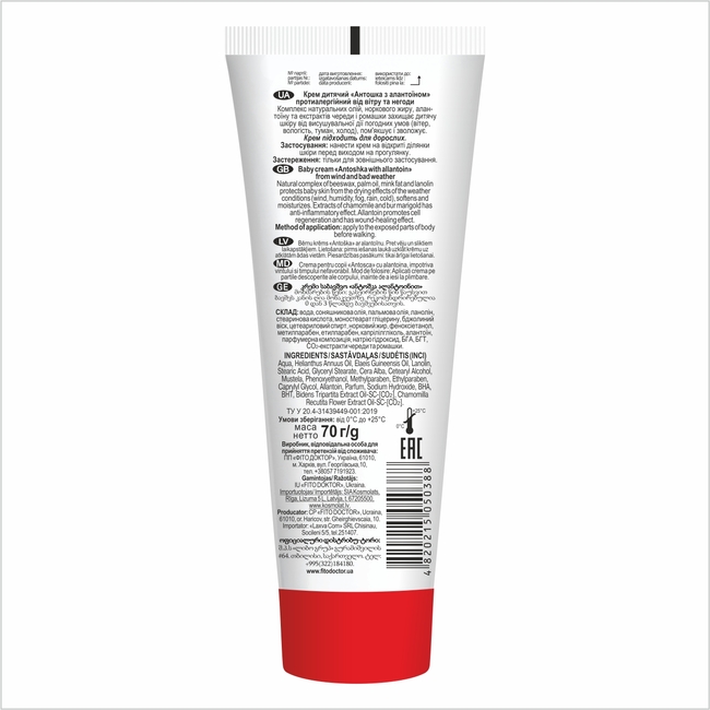 Детский крем «Антошка с аллантоином» создан для защиты нежной кожи ребёнка от неблагоприятных погодных условий. Крем помогает уменьшить пересушивающее действие ветра, холода, влажности и тумана, смягчает и увлажняет кожу. Комплекс натуральных масел, норкового жира, аллантоина и экстрактов череды и ромашки питает кожу, успокаивает её и поддерживает комфортное состояние. Крем также отлично подходит для ухода за кожей взрослых.