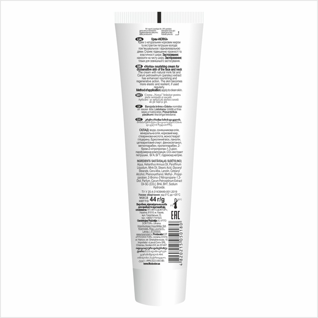 Состав: вода, подсолнечное масло, минеральное масло, норковый жир, стеариновая кислота, моностеарат глицерина, пчелиный воск, ланолин, цетеариловый спирт, феноксиэтанол, метилпарабен, пропилпарабен, 2-бром-2-нитропропан-1,3-диол, парфюмерная композиция, СО2-экстракт петрушки, BHA, BHT, гидроксид натрия.
