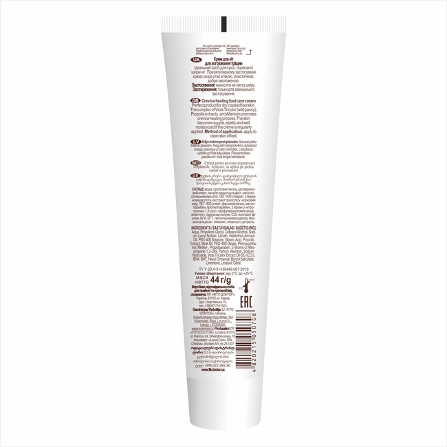 Крем ідеально доглядає за сухою та потрісканою шкірою ніг, сприяючи загоєнню дрібних тріщин. Комплекс екстрактів фіалки, прополісу та алантоїну пом’якшує шкіру, робить її еластичною та добре зволоженою при регулярному використанні.