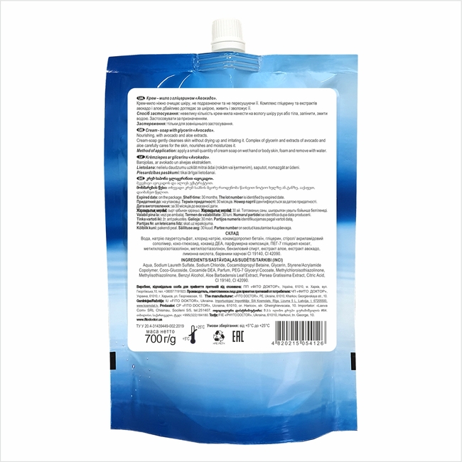 Дой-Пак крем-мило з гліцерином Fitodoctor «Авокадо», живильне, 700 мл