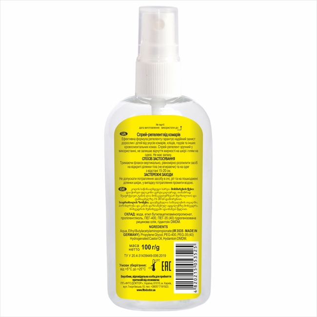 Склад: Aqua, IR 3535 (Ethyl Butylacetylaminopropionate), Propylene Glycol, PEG-400, PEG-35 (40) Hydrogenated Castor Oil, Hydantoin DMDM.