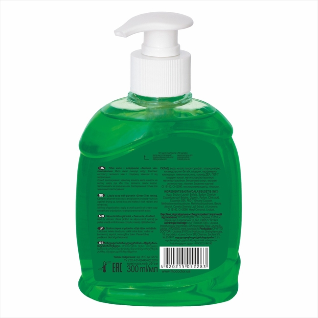 Рідке мило «Зелений чай» — це поєднання ніжного очищення та тонізуючого догляду за шкірою. Воно делікатно видаляє забруднення, не пересушуючи та не подразнюючи шкіру. Завдяки комплексу зеленого чаю та гліцерину шкіра залишається свіжою, м’якою та доглянутою.